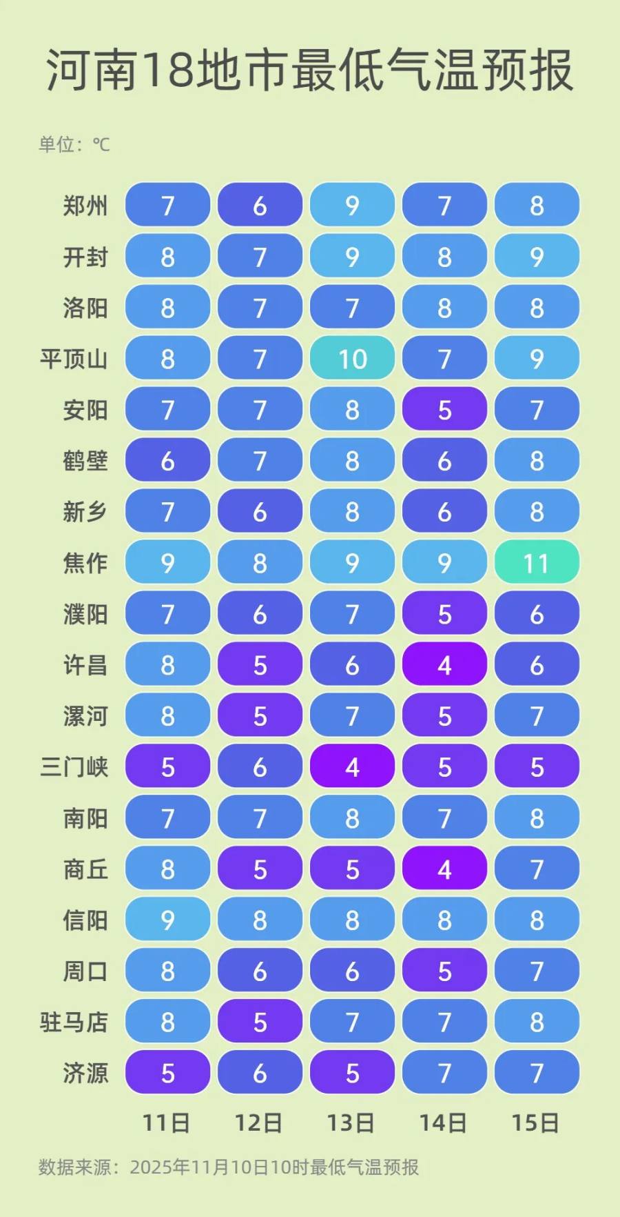 在本周末的冷空气影响之前,今后五天,我省气温波动不大。10日和13日最高气温多在15℃上下,其他时段基本维持在18-20℃之间。同时早晚依旧寒凉,最低气温个位数已经成为常态,早晚外出需持续做好保暖。