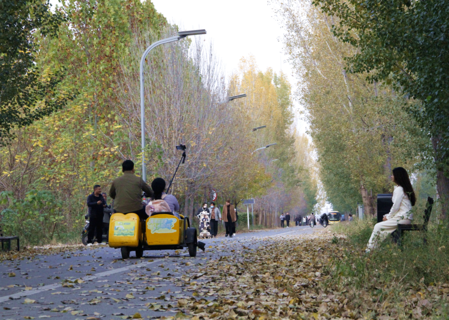 “现在身边的美景越来越多了,不用出市区就能享受这种浪漫的感觉。”深秋时节,郑州市惠济区疏影路并未像平常印象中的那样干净无物,道路及两侧地面上反而铺满了金黄色的落叶,与枝头各色彩叶共同形成了一个浪漫的童话世界。现场有新人在拍婚纱照,记录美好瞬间;也有市民携家人漫步其间,尽享自然馈赠。