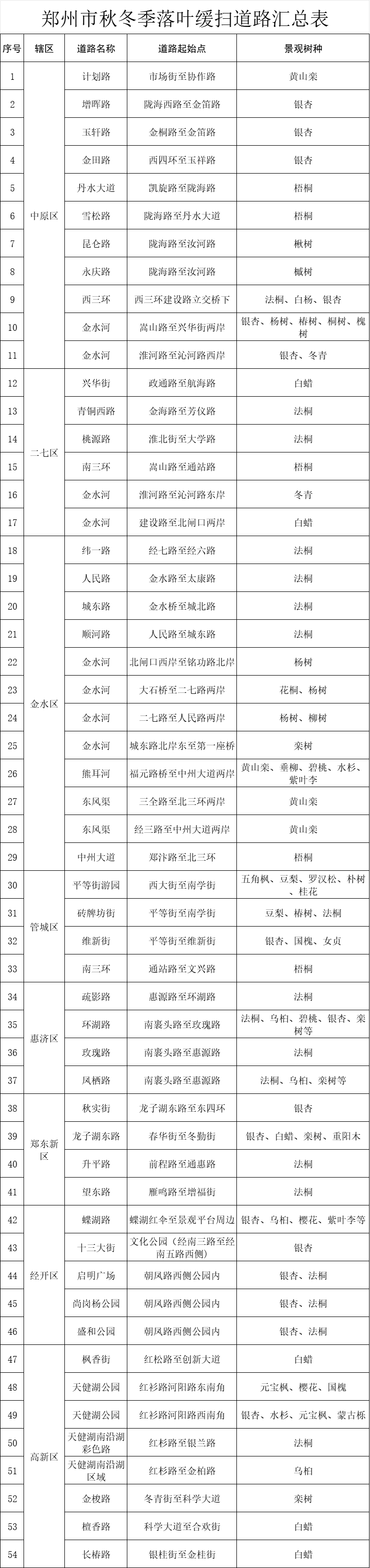 附:郑州市秋冬季落叶缓扫道路汇总表