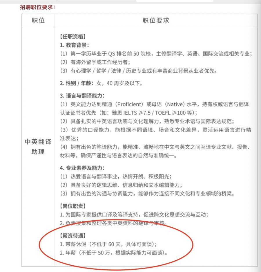公告显示,该职位要求应聘者为女性,且在40周岁及以下。在薪资待遇方面,年薪不低于50万元,且享受不低于60天的带薪休假。