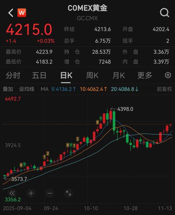 当地时间11月12日,国际金价连续第4个交易日上涨,在重回4100美元两天后,再次突破4200美元关口。COMEX黄金涨2.07%,报4201.4美元/盎司;伦敦现货黄金突破4200美元关口后回落,收报4194.605美元/盎司,涨1.68%。11月13日,国际金价盘中再次波动,截至15时,仍站稳4200美元上方。