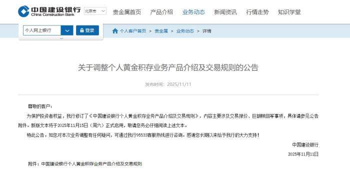 同日,中国建设银行发布公告称,调整个人黄金积存业务产品介绍及交易规则,内容主要涉及交易报价、巨额赎回等事项,新版文本将于2025年11月15日正式启用。