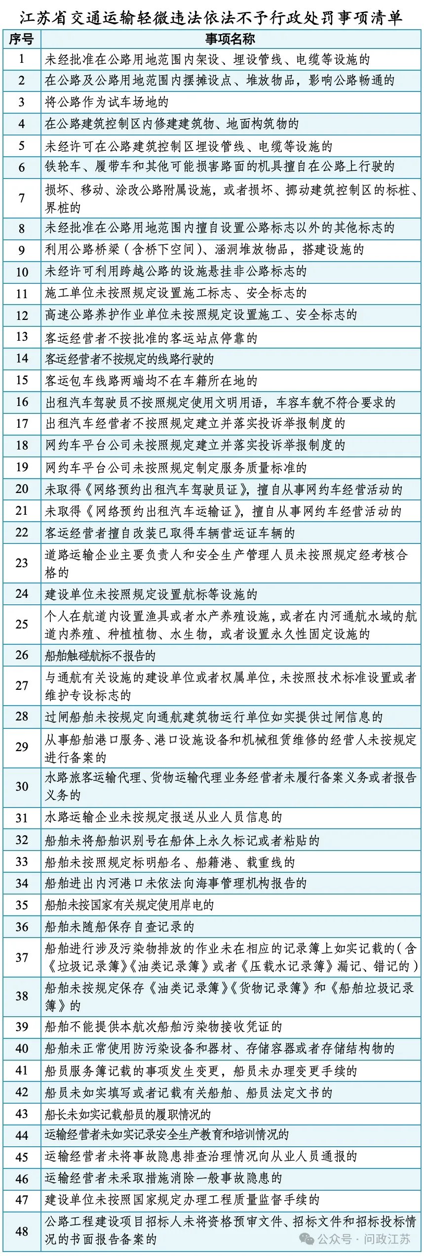 近日,江苏省交通运输厅印发《江苏省交通运输轻微违法依法不予行政处罚事项清单》(以下简称《清单》),《清单》将于2025年12月1日起施行。