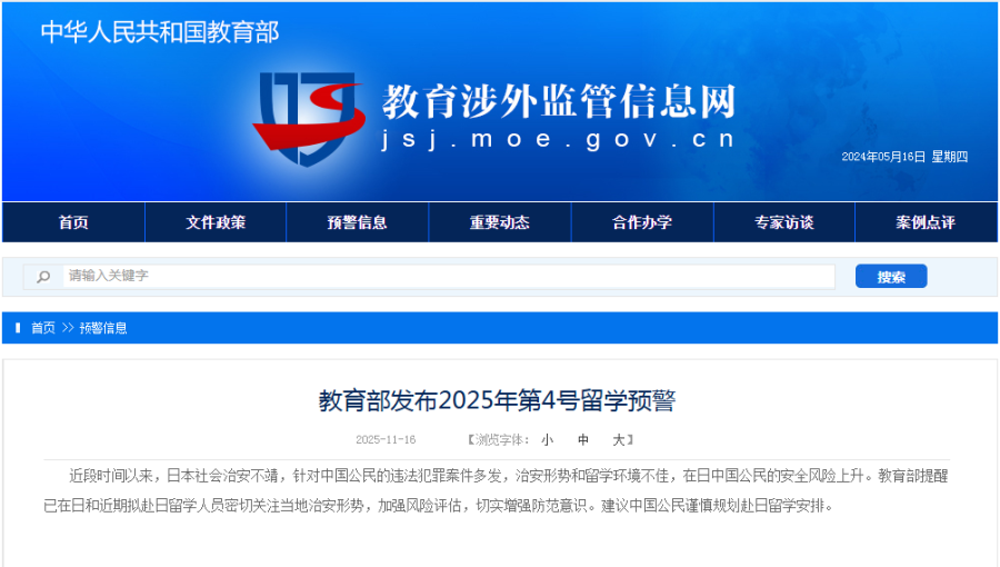 教育部发布留学预警:中国公民谨慎规划赴日留学安排