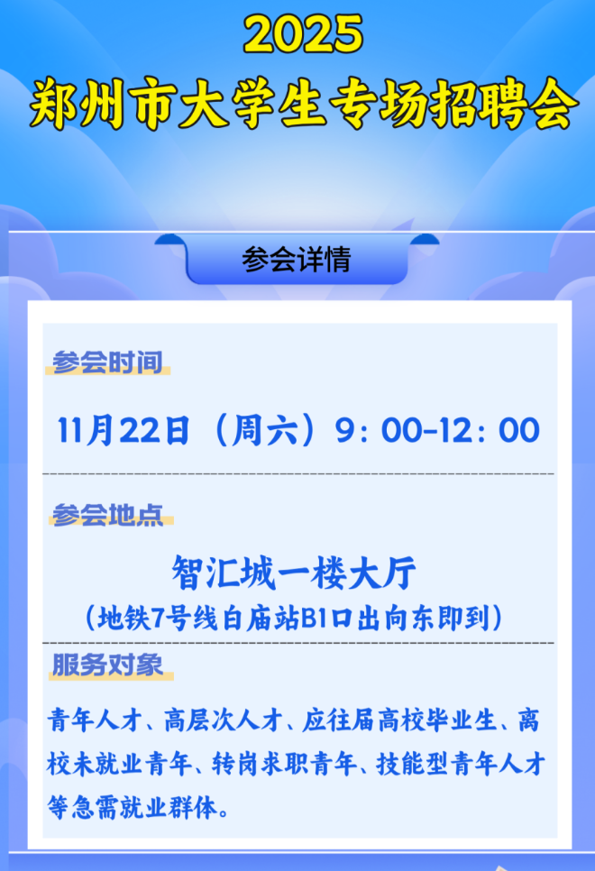 招聘会地址:智汇城一楼大厅(地铁7号线白庙站B1口出向东即到)