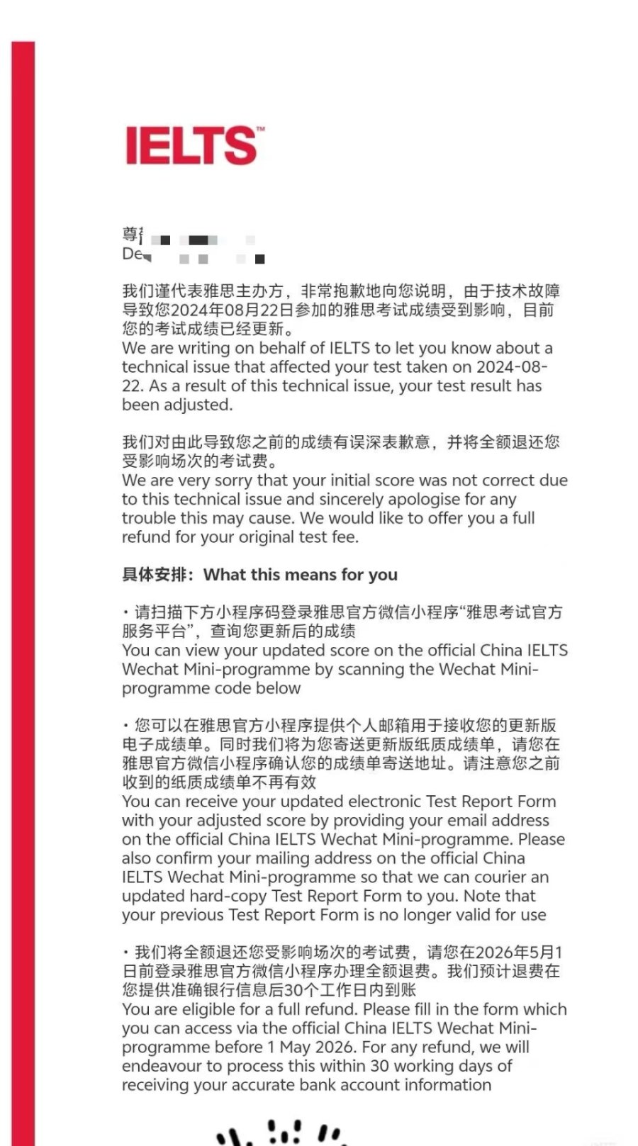 看似只是分数上0.5分的调整,背后却可能是考生被改写的人生。据报道,多名受影响的考生正是因技术故障被压低0.5分,不得不重考一次甚至多次。在紧张的申请季和硬性录取条件面前,这样的失误加剧了考生的焦虑与自我怀疑,其所造成的时间和心理损失远非金钱可以弥补。更令人遗憾的是,有考生因此错过申请窗口,被迫调整人生规划,甚至彻底放弃留学梦想。