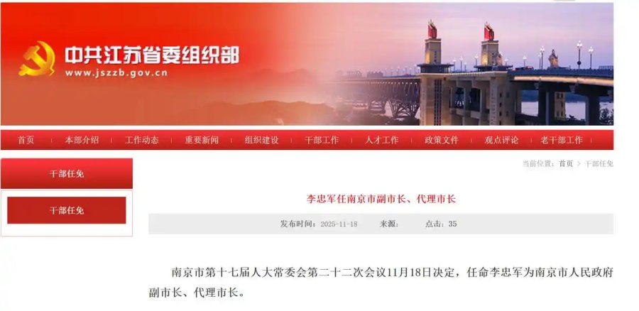 据“江苏先锋”,南京市第十七届人大常委会第二十二次会议11月18日决定,任命李忠军为南京市人民政府副市长、代理市长。