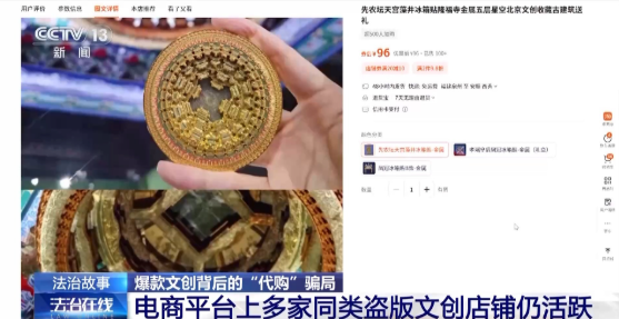 北京市文化市场综合执法总队四支队 沈开宇:以天宫藻井冰箱贴为例,二创这种产品当时销售的价格比较低,销量是比较大的,进货价是七十元,当时售卖的是八十五元,每一个都能赚十五元。还有一类是所谓的正品,就是说代购途径去购买的,这种赚的就比较多了,一个的售卖价是一百一十七元左右,进货价只有七八十元,这样就好几十块钱的利润。