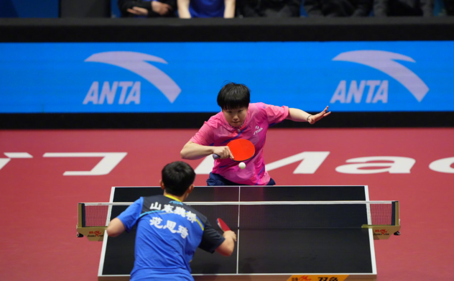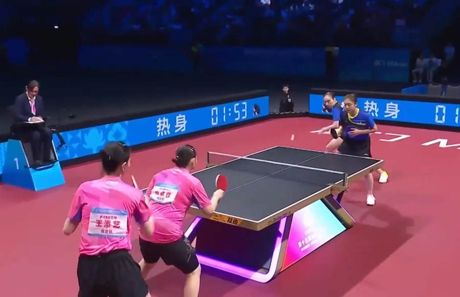 首场比赛,王晓彤/陈梦组合分别以11-8、11-7、11-5战胜何卓佳/王添艺,总比分1比0,山东队获首盘胜利。