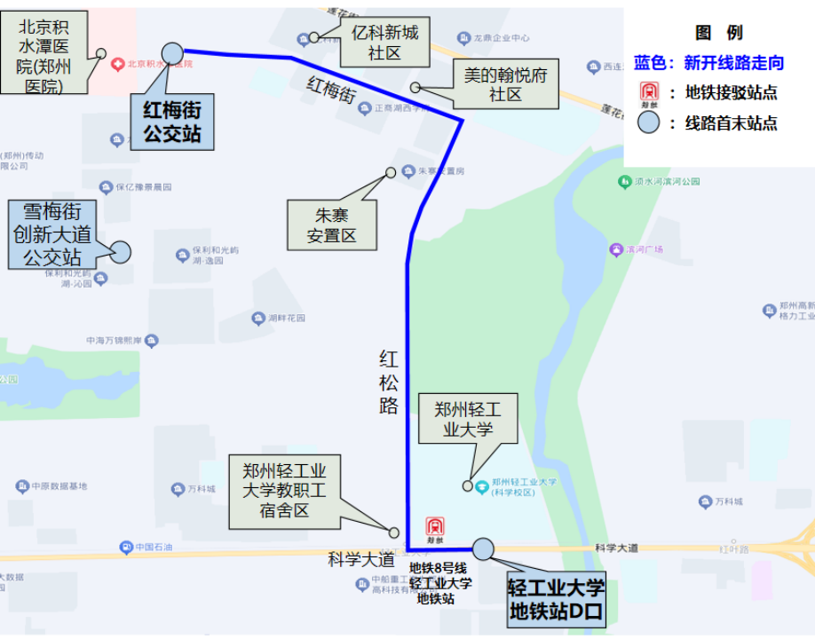 途经道路:郑新路、延祥路、裕国路、延顺路、春月街、延祥路、强国路、豫六路、强国路、春月街、延顺路、裕国路、浔江中路、郑新路。