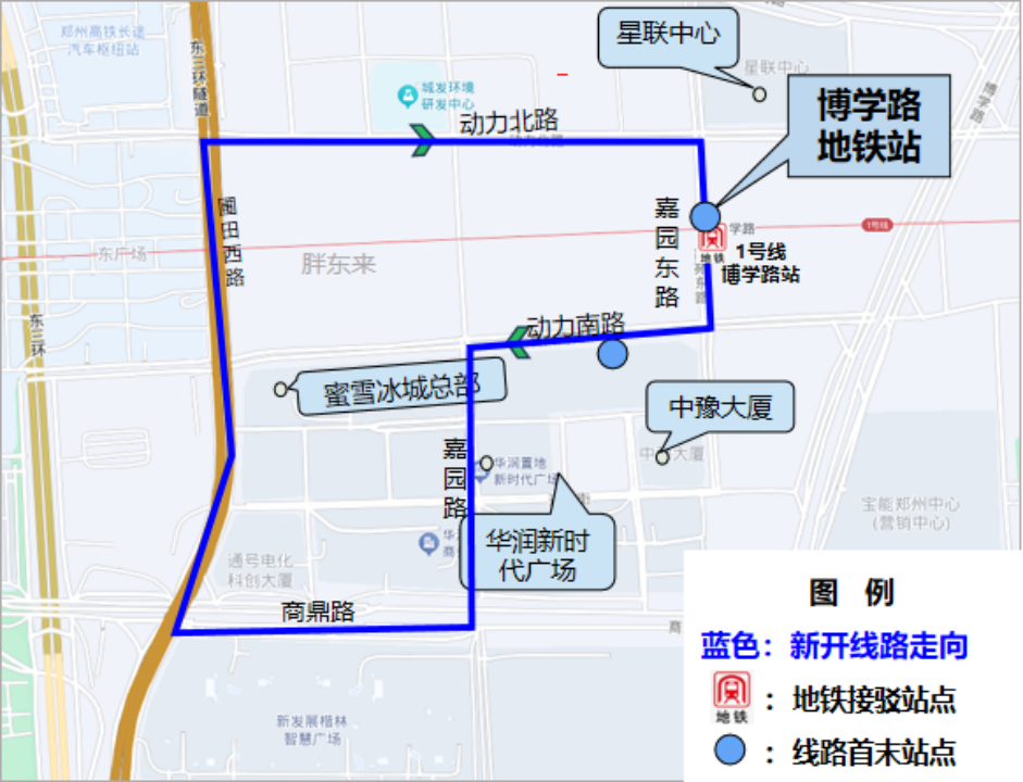 途经道路:嘉园东路、动力南路、嘉园路、商鼎路、圃田西路、动力北路、嘉园东路