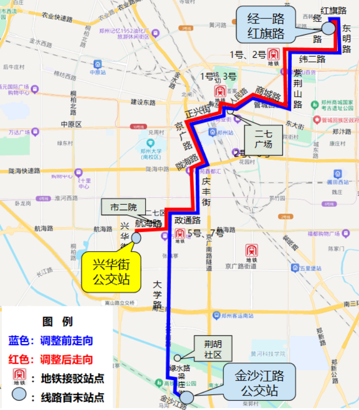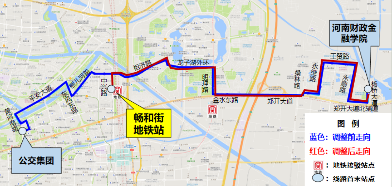 途经道路调整为:兴华街、航海路、大学路、政通路、庆丰街(下行:交通路)、陇海路、京广路、中原路、正兴街(下行:解放路、福寿街)、人民路、商城路、紫荆山路、花园路(下行:政二街、金水路)、纬二路、东明路、红旗路、经一路、黄河路。