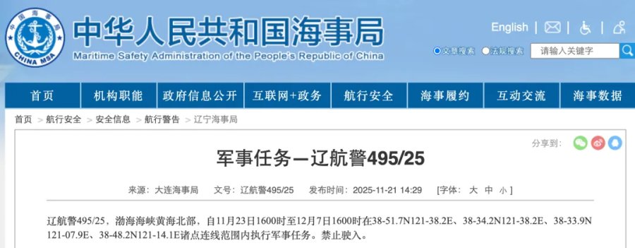 大连海事局发布航行警告,渤海海峡黄海北部水域有军事任务,持续两周