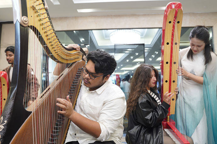 外国友人体验箜篌演奏 本报记者 马健 摄