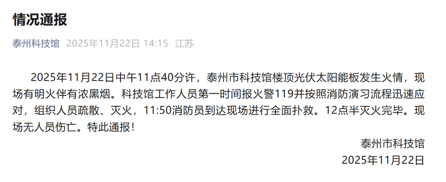 楼顶太阳能板起火?泰州科技馆微信公众号发布情况通报:2025年11月22日中午11点40分许,泰州市科技馆楼顶光伏太阳能板发生火情,现场有明火伴有浓黑烟。科技馆工作人员第一时间报火警119并按照消防演习流程迅速应对,组织人员疏散、灭火,11:50消防员到达现场进行全面扑救,12点半灭火完毕,现场无人员伤亡。