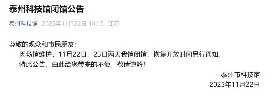 因场馆维护,11月22日、23日两天泰州市科技馆闭馆,恢复开放时间另行通知。