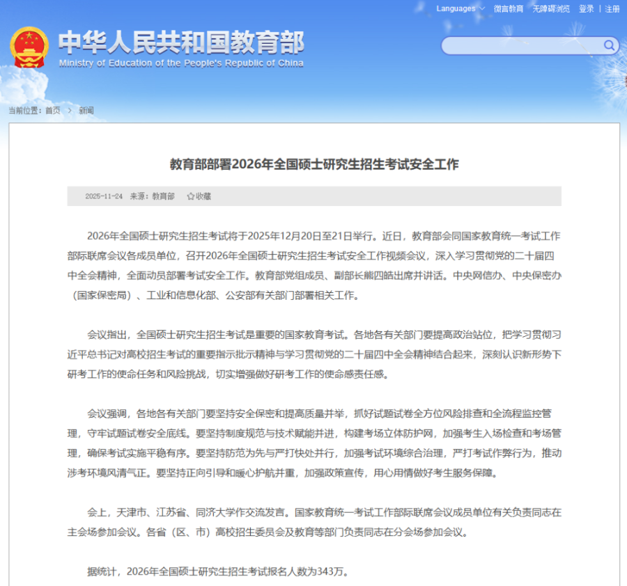 报名人数343万,2026年全国硕士研究生招生考试12月20日至21日举行