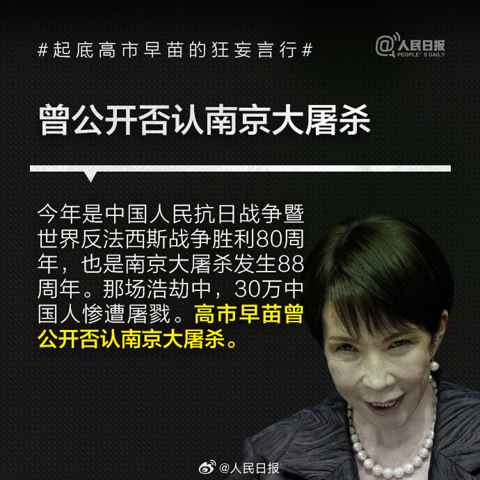 否认南京大屠杀、参拜靖国神社超10次!央媒起底高市早苗狂妄言行