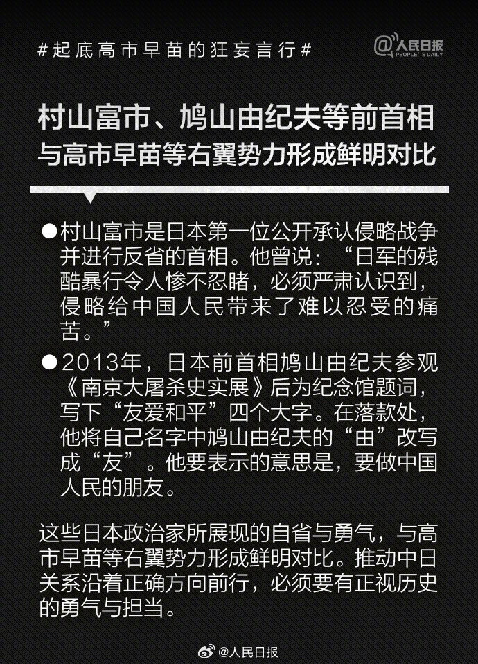 1993年高市早苗当选日本国会议员后,公开主张修改日本和平宪法、扩大和改名日本自卫队、参拜靖国神社,其言行与许多臭名昭著的日本右翼政客如出一辙。高市2014年来参拜靖国神社超10次。历史的教训岂敢忘却!我们绝不允许日本军国主义复活,破坏世界和平稳定。