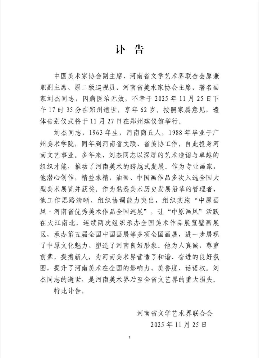 据河南省文学艺术界联合会,中国美协副主席、河南省美协主席、著名画家刘杰因病在郑州逝世,享年62岁。