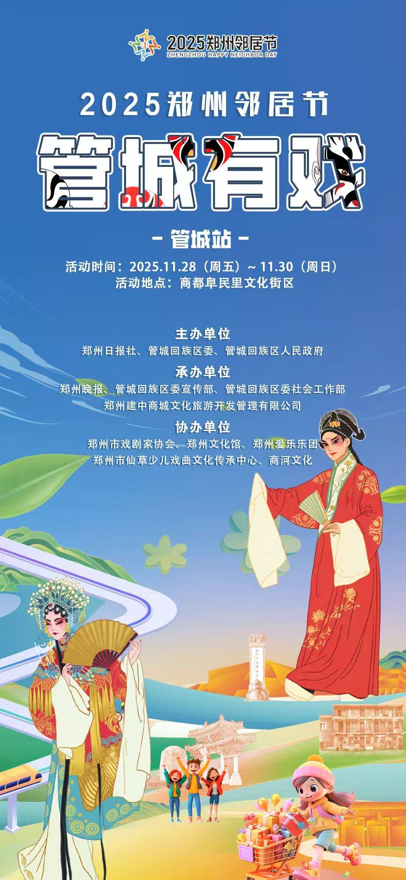 家人们!郑州人专属的温情盛宴来啦!年度最暖邻里盛会强势回归,2025郑州邻居节管城站带着满满诚意,将于11月28日-30日在商都阜民里文化街区热力启幕!作为郑州家喻户晓的亲民惠民IP,此次邻居节紧扣“红色纽带・温情社区”核心主题,以“郑州邻居节 管城有戏”为专属亮点,这里的“戏”不止戏曲,更是包罗万象的精彩表演、干货满满的便民福利与创意十足的互动体验,这场集文化、健康、欢乐于一体的3天狂欢,绝对让你玩得尽兴、看得过瘾、满载而归!