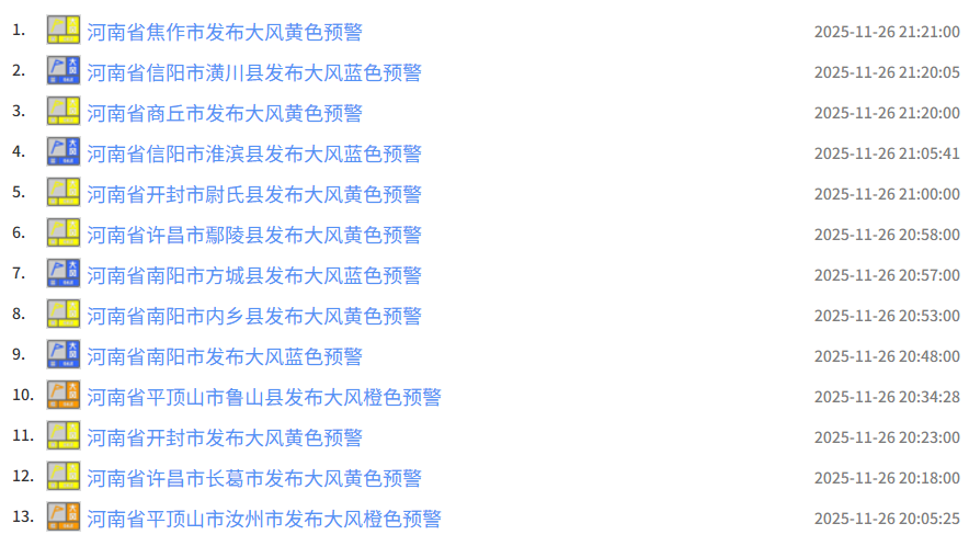 新野县气象台2025年11月26日17时18分发布大风蓝色预警信号:预计未来24小时内,新野县所辖乡镇和街道将出现4到5级大风,阵风7级以上,请相关单位和个人做好大风防范工作。