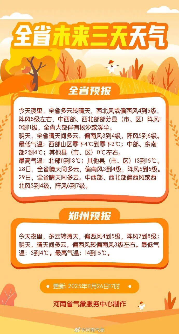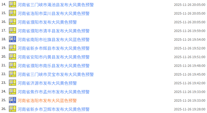 截至11月26日18:50,河南共101条预警生效中。其中,安阳林州发布大风橙色预警。