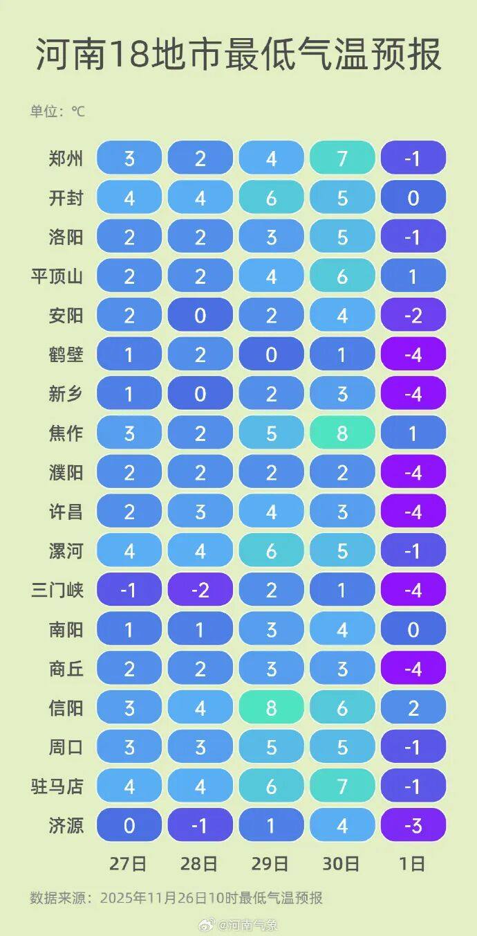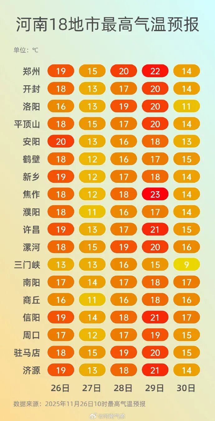 像郑州,今天最高气温19℃,明天降至15℃,29日又将升到22℃,30日又降至14℃。