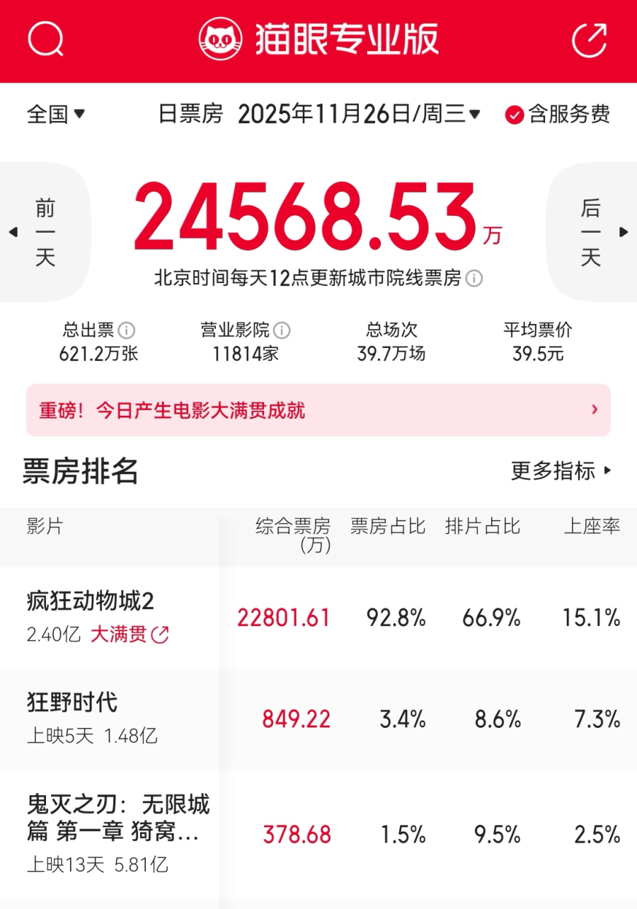 此外,据猫眼专业版数据,截至11月26日24时,《疯狂动物城2》的排片占比为66.9%,远超《狂野时代》8.6%、《鬼灭之刃:无限城篇》9.5%的排片率。影片的英文(原版)累计贡献票房1.79亿元,占比高达74.6%。
