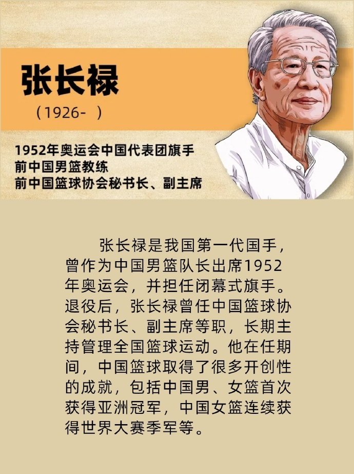 张长禄先生毕生致力于中国篮球事业,是中国篮球界的杰出代表和先驱。作为新中国第一批男篮国手,他曾在1952年赫尔辛基奥运会闭幕式上担任新中国的首位奥运旗手。他曾任中国篮协秘书长和副主席,并于1999年荣膺“新中国篮球运动杰出贡献奖”,2001年获国际篮联最高荣誉奖,2022年以“特别致敬人物”身份进入中国篮球名人堂,其贡献彪炳史册。