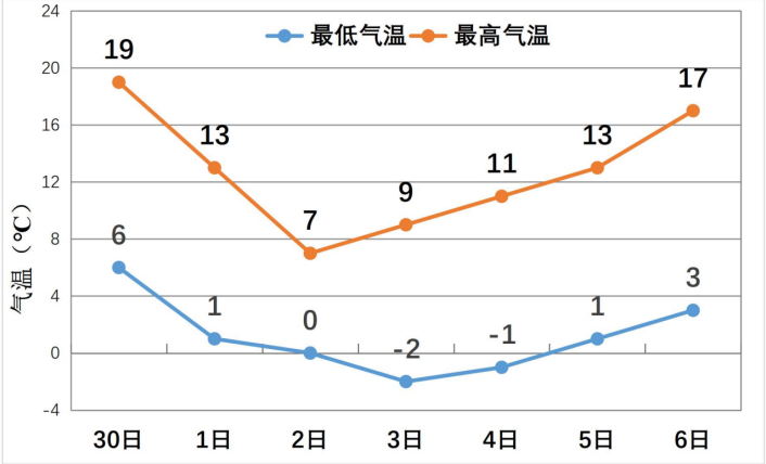另据郑州市气象局第17期《天气报告》,预计11月30日至12月3日有两轮冷空气影响我市,11月30日偏西风3到4级,阵风6到7级,并伴有扬沙或浮尘;12月1日起气温持续下降,最高气温较前期下降10℃到12℃,12月3日早晨最低气温零下2℃,西部山区零下4℃左右。