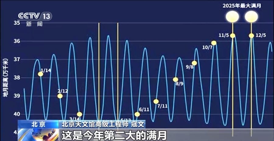 北京天文馆高级工程师 寇文:12月5日大约早晨7点14分是满月,而月亮过近地点的时间是在这之前大约12个小时,这是今年第二大的满月,也可以算是一次“超级月亮”。