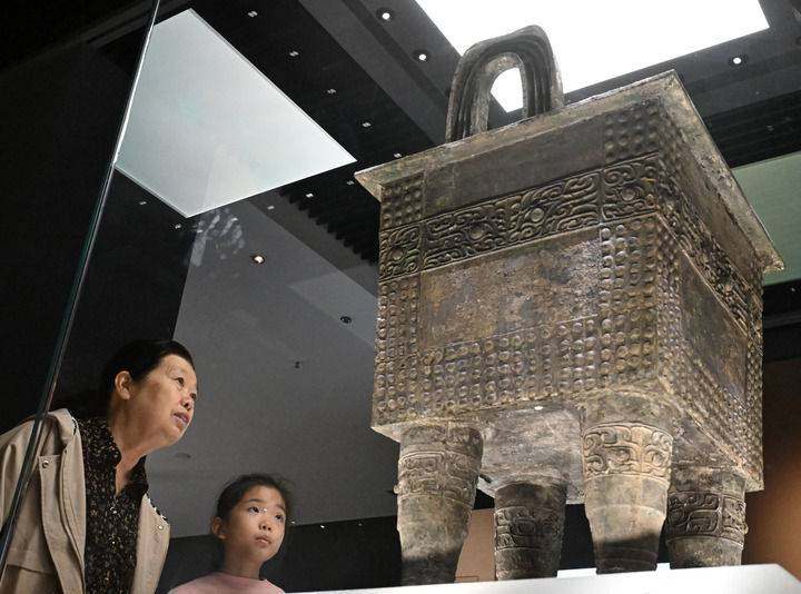 2025年10月3日,游客在“国宝回家乡——纪念郑州商城发现70周年考古新发现展”参观杜岭一号方鼎。新华社记者 李嘉南 摄