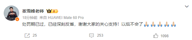12月3日,张雪峰在社交平台发文:“处罚期已过,已经深刻反省,谢谢大家的关心支持!以后不会了。”