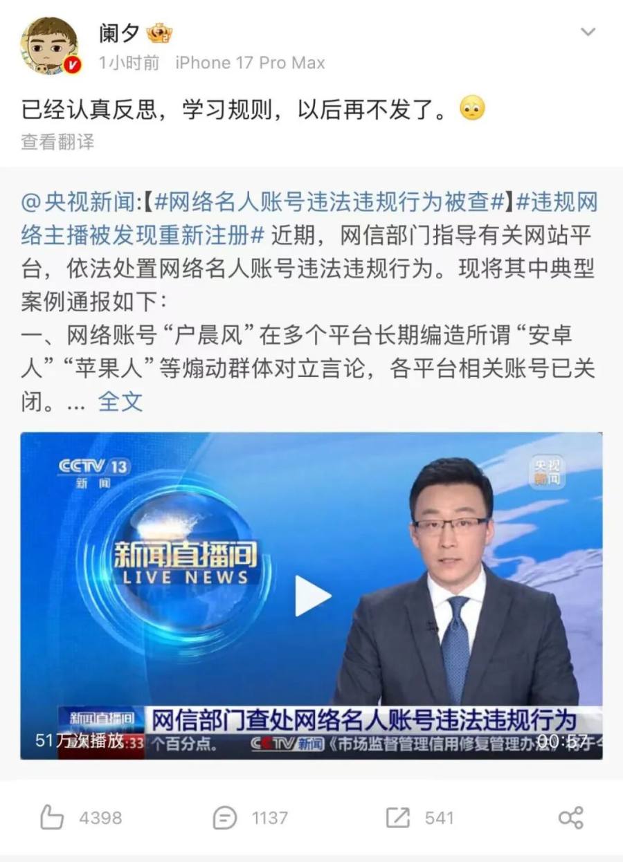 一、网络账号“户晨风”在多个平台长期编造所谓“安卓人”“苹果人”等煽动群体对立言论,各平台相关账号已关闭。