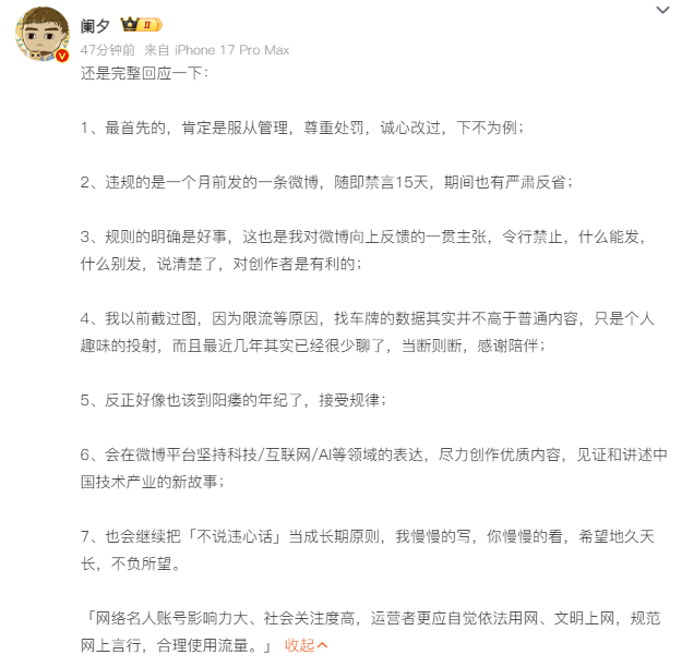 12月3日,网信部门通报:微博账号“阑夕”发布宣介境外色情影片内容,抖音主播“张雪峰”在直播中长时间使用污言秽语,相关账号已限期禁言、停播。