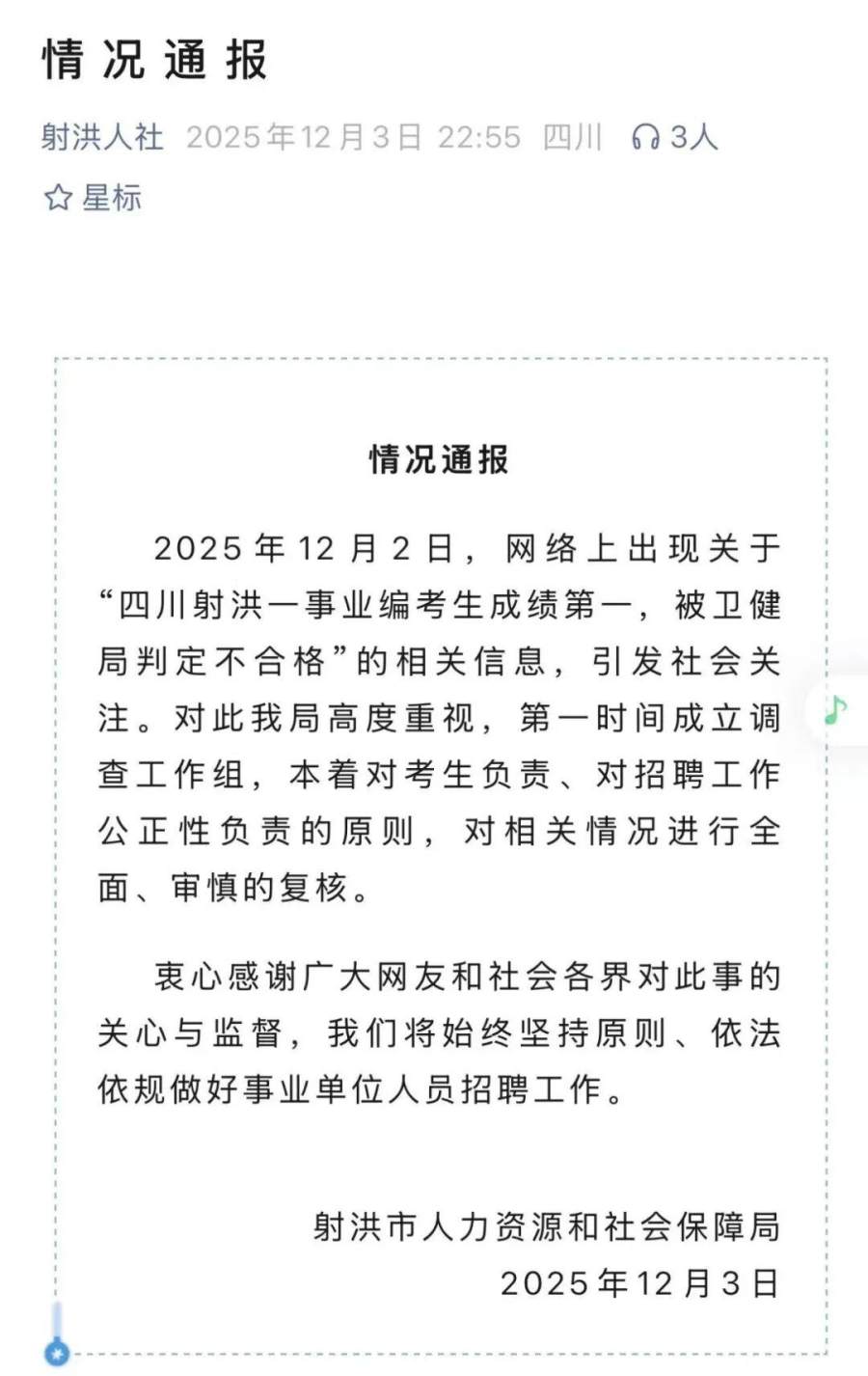 2025年12月2日,网络上出现关于“四川射洪一事业编考生成绩第一,被卫健局判定不合格”的相关信息,引发社会关注。对此我局高度重视,第一时间成立调查工作组,本着对考生负责、对招聘工作公正性负责的原则,对相关情况进行全面、审慎的复核。