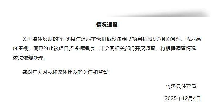 12月4日,湖北竹溪县住建局发布情况通报:关于媒体反映的“竹溪县住建局本级机械设备租赁项目招投标”相关问题,我局高度重视,现已终止该项目招投标程序,并会同相关部门开展调查,将根据调查情况,依法依规处理。