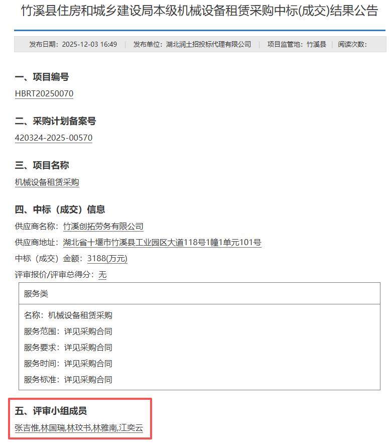 近日,有网友反映中国政府采购网公布的“竹溪县住房和城乡建设局本级机械设备租赁采购中标(成交)结果公告”第五项评审小组成员中,5位评审小组成员名字与百度文库“10000中国普通人名大全”前五个名字一致,此事引发网友质疑。