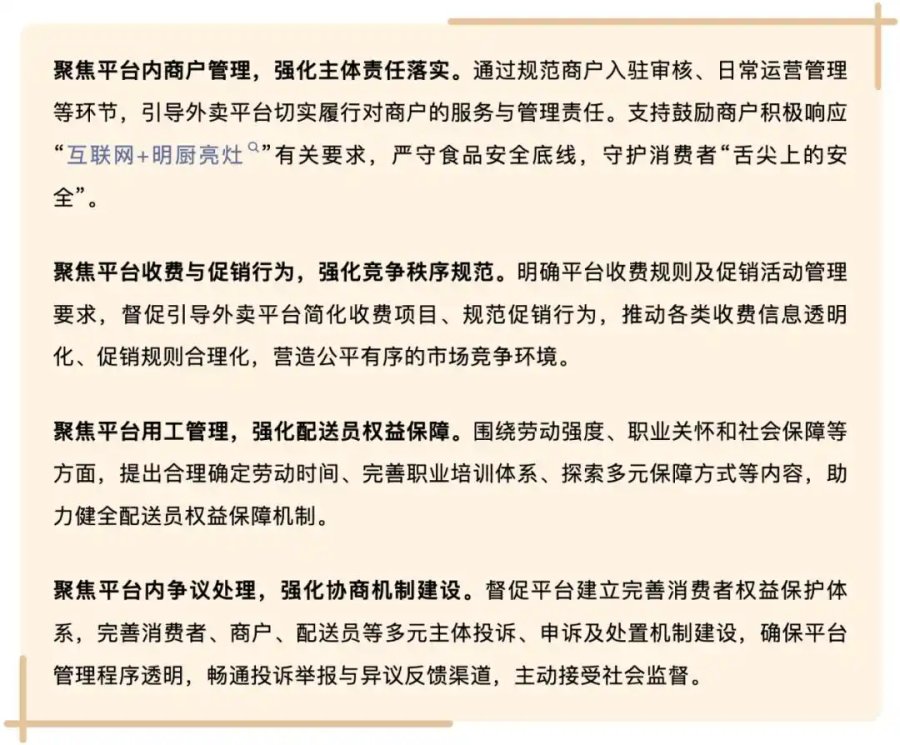 《基本要求》立足行业实际,坚持“需求牵引、问题导向”,提出“四个聚焦、四个强化”,推动引导外卖平台同步深化整改。包括:聚焦平台内商户管理,强化主体责任落实;聚焦平台收费与促销行为,强化竞争秩序规范;聚焦平台用工管理,强化配送员权益保障;聚焦平台内争议处理,强化协商机制建设。