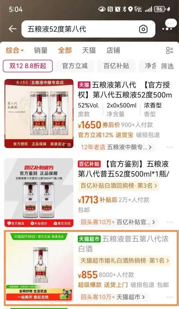 当前,价格倒挂已经成为白酒行业普遍现象。记者调查发现,目前天猫商城第八代五粮液价格多在820元/瓶~850元/瓶区间;京东自营价格在845元/瓶上下(含平台补贴)。
