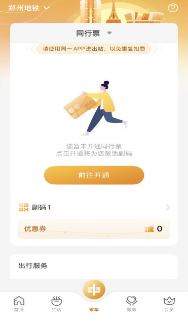 选择“前往开通”,绑定支付方式(仅支持支付宝、微信、云闪付支付方式),选择相应副码(最多支持激活4个副码),点击切换按钮,勾选《同行票使用协议》《同行票使用规则》,点击立即开通则激活同行票功能。