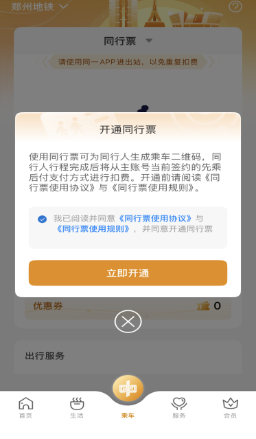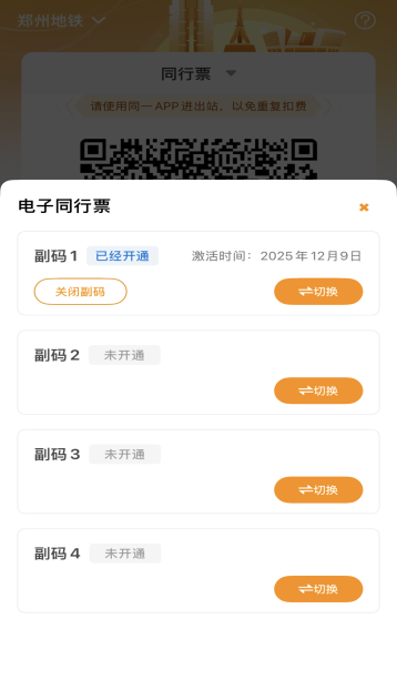 即日起,郑州地铁商易行APP正式推出电子同行票功能,乘客打开商易行APP乘车界面,选择同行票票种,开通电子同行票“副码”功能,即可实现一人带四人的快速过闸,仅支持绑定支付宝、微信及云闪付扣费方式,享受先乘车后付费及多人乘车一人付费的便捷乘车体验,让同行乘客出行更便捷。