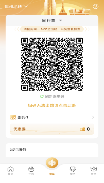 4.出站时因无进站信息无法出站,可通过郑州地铁商易行 APP“乘车”界面点选相应副码“扫码无法出站”处理后扫码出站。