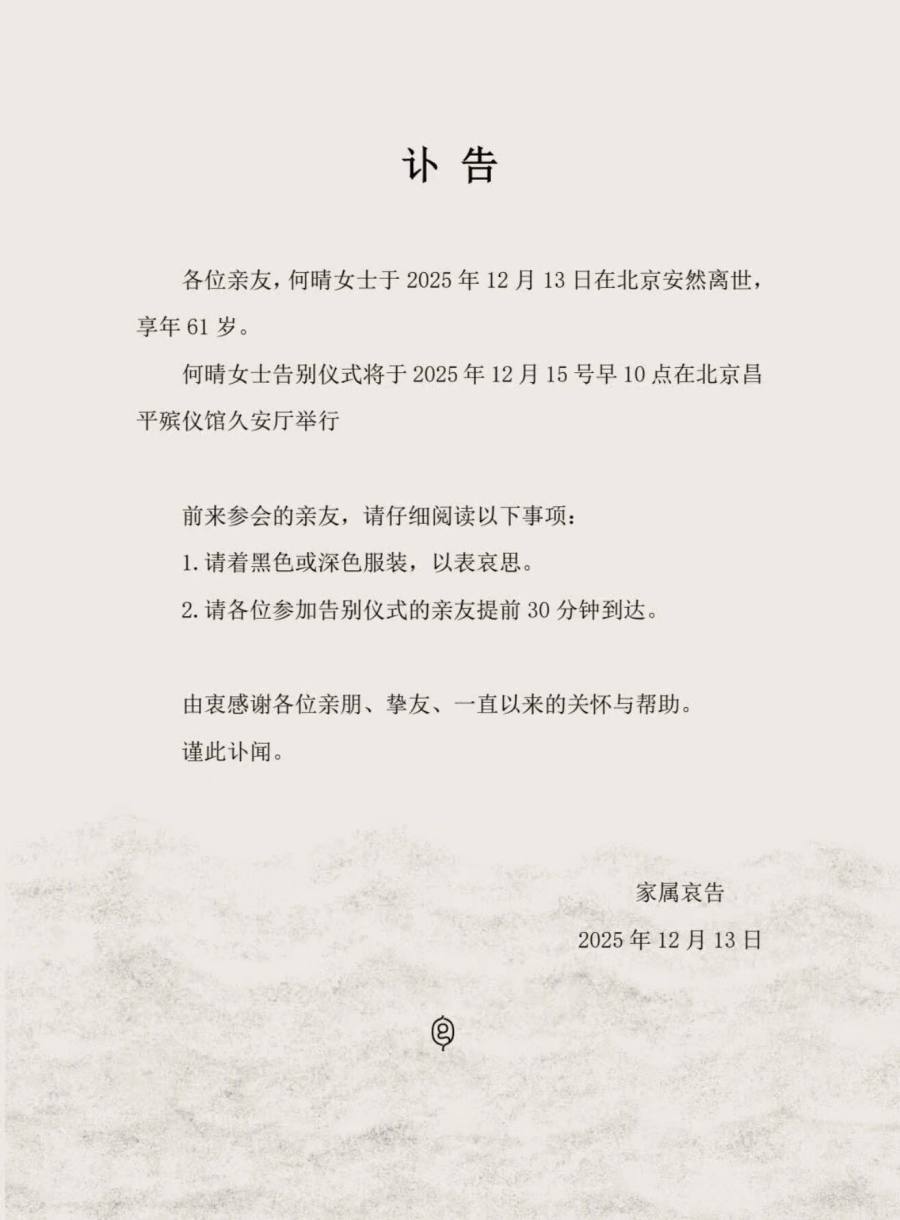 据南京艺术学院口述历史中心特聘研究员、电影研究者余泳消息,影视演员何晴因病于2025年12月13日在北京离世,享年61岁。