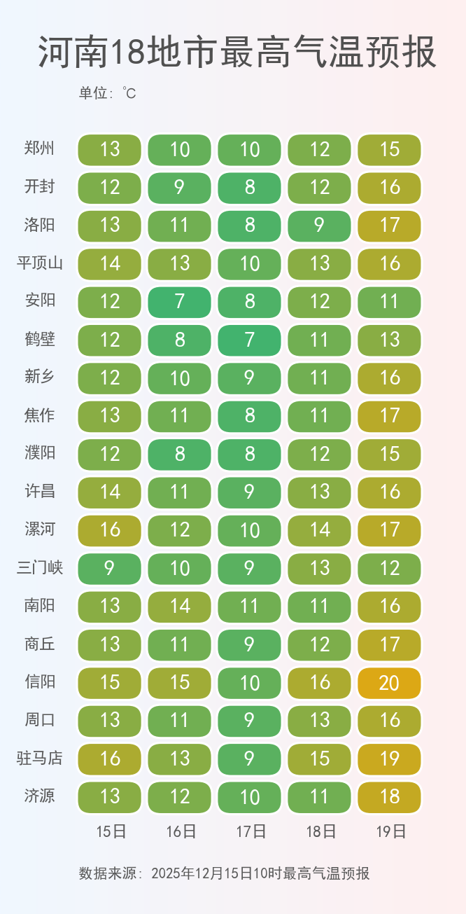 在西北气流控制下,预计本周前中期(周一至周五),河南大部都将以晴天或多云天气为主,受弱冷空气影响,周一至周三,全省的最高气温将缓慢下滑至10℃上下,不过随着冷空气影响结束升温进程继续,周五大部地区的最高气温将再度升至15℃+。