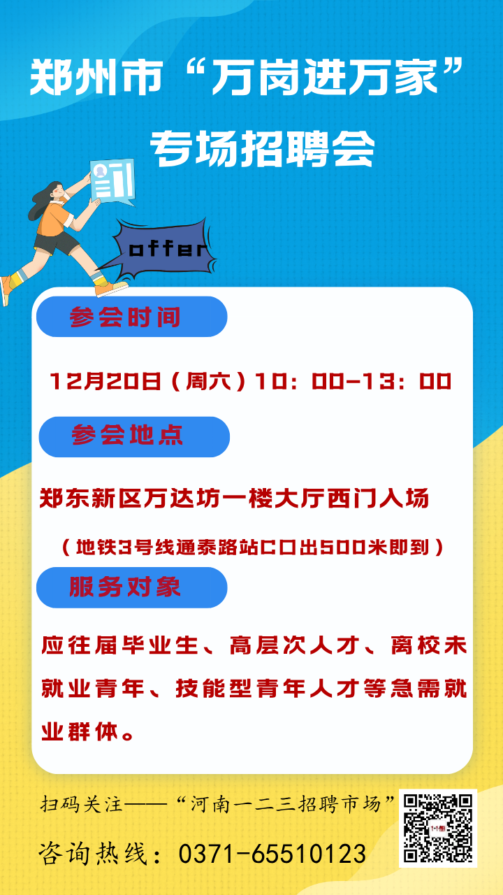 本周六,又一场可以提供万余岗位的招聘会来了——12月16日,记者从郑东新区组织人事和社会保障局获悉,12月20日(周六)上午,该局和郑东新区总工会、祭城路街道办事处联合河南123人才网,将在郑东新区万达坊一楼大厅(西门入场)共同举办郑州市“万岗进万家”专场招聘会。