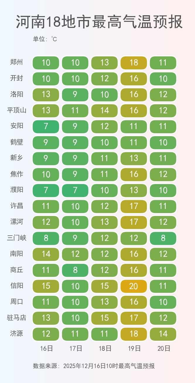 而本周后期(19-21日),一股较强冷空气的到来,河南气温又将开启“过山车”模式:本周五先来一波明显升温,多地午后气温升至15-18度,信阳等地甚至超过20度!暖意短暂回归后,随着冷空气继续扩散南下,周末气温又将直线下跌6度左右,本周日全省最高气温仅有个位数,重现先升后降的天气“戏码”,注意关注气温变化,及时添衣保暖!