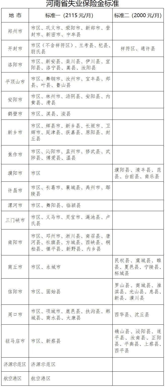 根据通知,失业保险金基本标准按照全省一类行政区域月最低工资标准的百分之九十确定,调整为2115元/月。其中,基本标准高于最低工资标准的三类行政区域,失业保险金标准按照不高于所在地最低工资标准确定,调整为2000元/月。纳入省直统筹的失业保险参保单位,失业保险金标准参照郑州市市区标准执行。调整标准所需资金由失业保险基金列支。