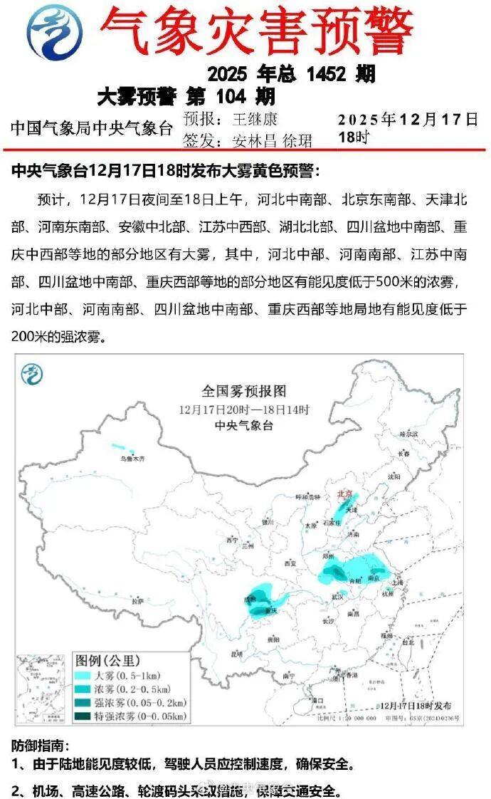 预计,12月17日夜间至18日上午,河北中南部、北京东南部、天津北部、河南东南部、安徽中北部、江苏中西部、湖北北部、四川盆地中南部、重庆中西部等地的部分地区有大雾,其中,河北中部、河南南部、江苏中南部、四川盆地中南部、重庆西部等地的部分地区有能见度低于500米的浓雾,河北中部、河南南部、四川盆地中南部、重庆西部等地局地有能见度低于200米的强浓雾。
